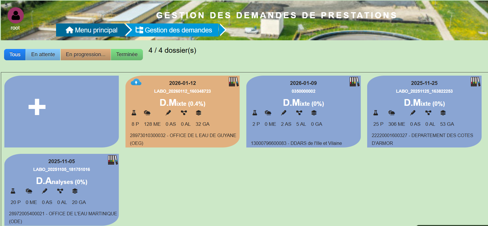 Solution logicielle LIMS full web (SaaS) destinée aux prestataires préleveurs, laboratoires d'analyses, associations ou bureaux d'études délégués, souhaitant réaliser des échanges de données informatisés avec des acteurs commanditaires (services de l'Etat, établissements publics ou privés, collectivités territoriales) selon les spécifications EDILABO définies par le SANDRE ®